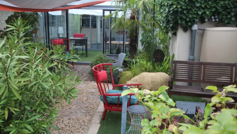 Accédez à notre terrasse ensoleillée avec vue sur les toits, parfaite pour vous détendre dans nos transats ou dans notre salon de jardin.